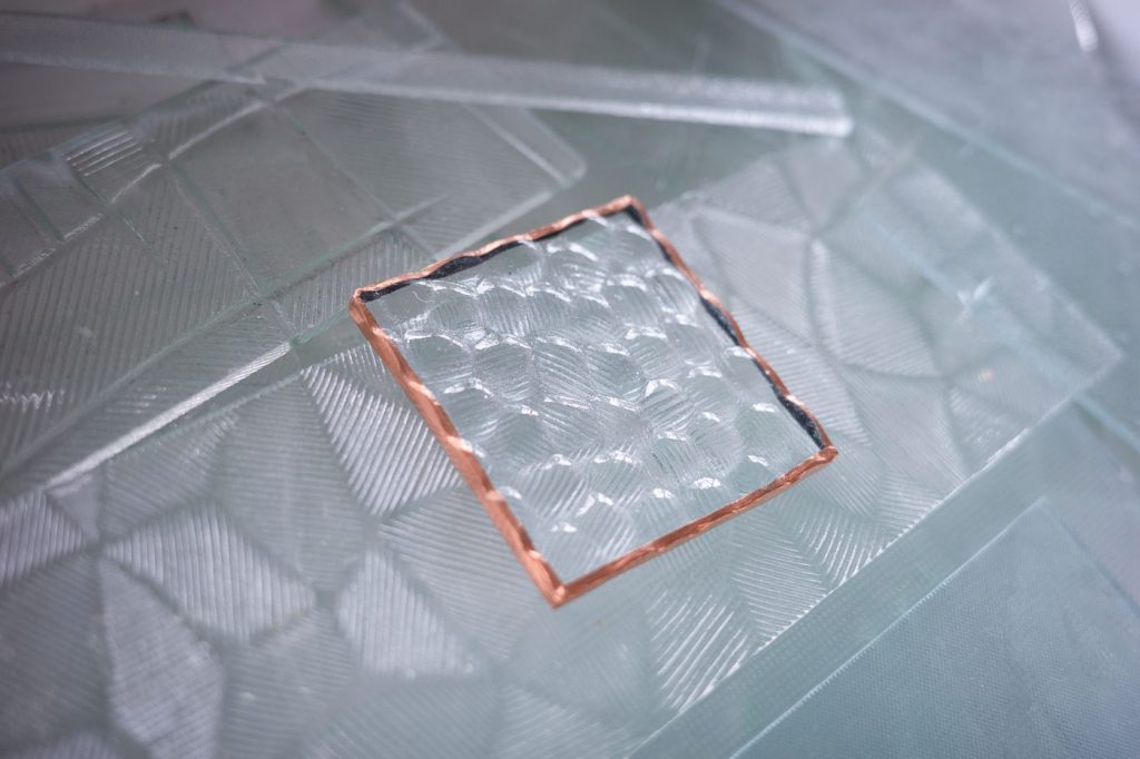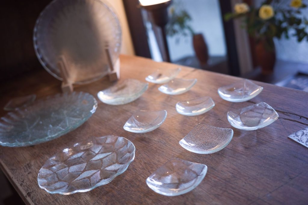 ガラスの模様は残しながら、型に沿ってゆっくりと曲げてお皿に加工した物や……