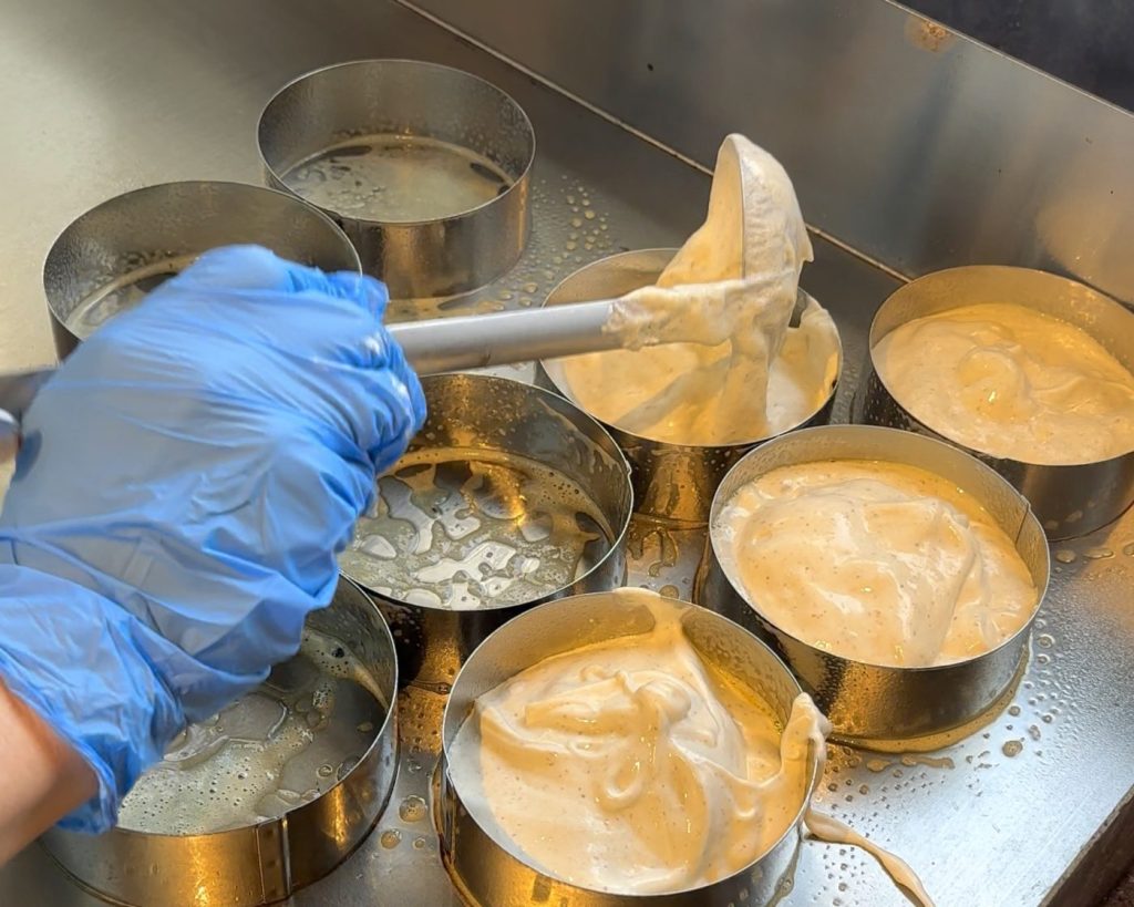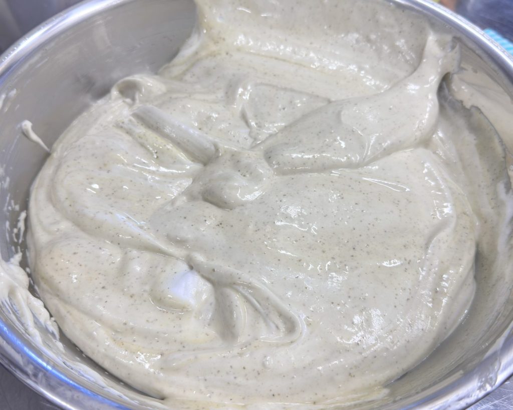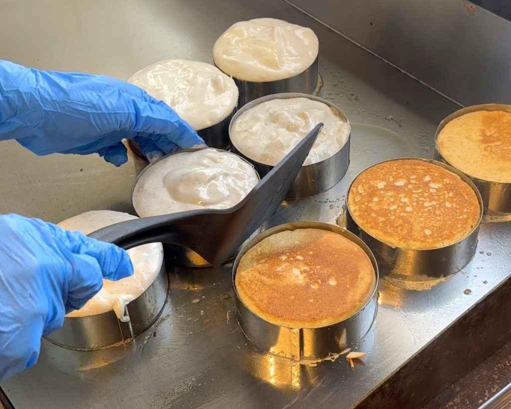 写真を見ると、生地の中に粒々が見えますよね。この生地は、食事系パンケーキに使われています。