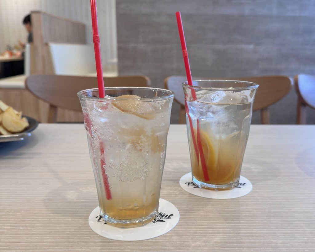 ジンジャーエールには生姜のスライスが、レモネードにはレモンのスライスが入っていて、見た目にも爽やか。
