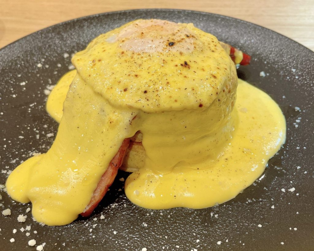 こちらはまだメニューには掲載されていませんが、大きなベーコンとポーチドエッグに、オランデーズソースをかけた新作「チーズとベーコンのパンケーキ」です。